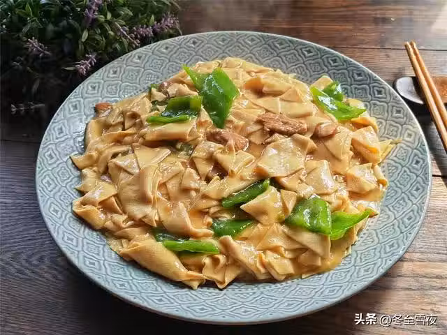【尖椒干豆腐】所需材料:干豆腐300克、尖椒2個、豬肉100克、油鹽適量、大蔥1段、姜2片、大蒜3瓣、料酒半湯匙、醬油1湯匙、雞精1茶匙、水澱粉適量、面鹼1克、