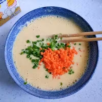 4、放入蔥花和胡蘿蔔丁,繼續攪拌均勻。