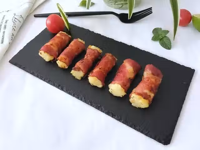 2、取一小團土豆泥捏成和培根片差不多寬的條,放在培根上,把培根片包著土豆泥捲起來碼入盤中。