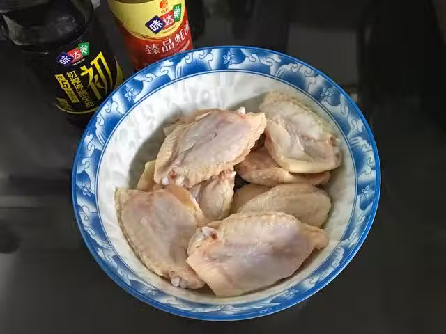 2、雞翅清洗乾淨,中間切一刀分成兩塊,加入1勺料酒,薑片,2勺生抽,1勺蚝油,少許鹽和糖,抓捏均勻,腌制1小時。
