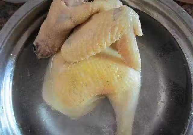 4.燜制20分鐘後雞肉基本已經熟了,但是雞皮還不夠脆,所以要進行最後關鍵的一步「浸冰水」;這個季節天氣已經非常的冷了,可以直接用自然冷卻的涼開水就可以,如果夏季就放到冰箱中冷藏幾個小時再用;將燜熟的雞從鍋中提出後立刻浸入涼水中浸泡5分鐘即可。