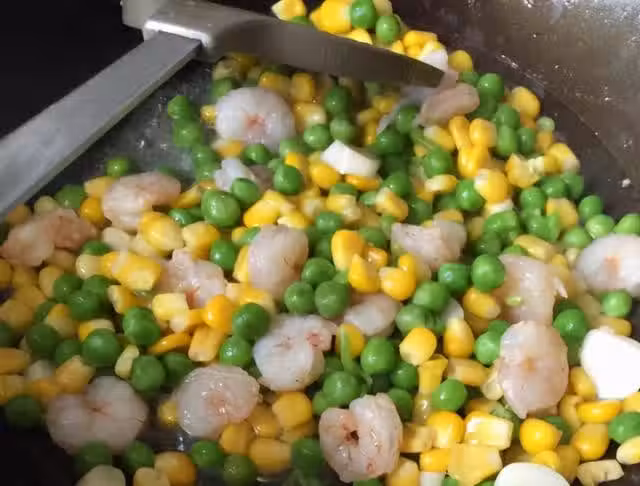 第四步,重新加上點油,放入玉米粒和青豆粒,快速翻炒下,2分鐘的時間,將蝦仁重新放回鍋中,快速炒均勻,喜歡水潤一點的可以烹入少許的水燜一下;