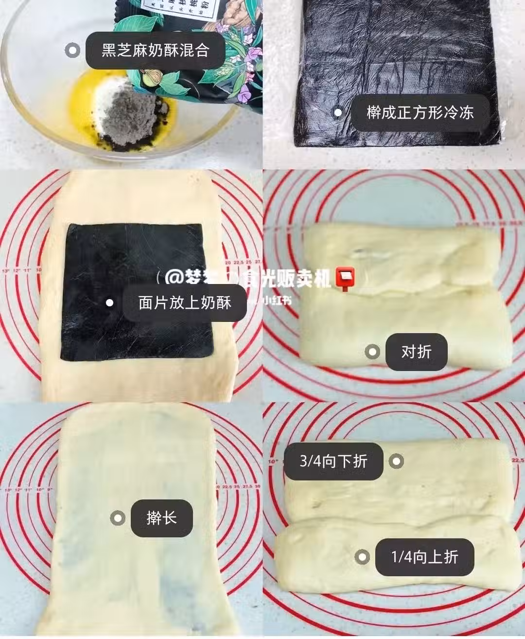 5.】發酵好的麵糰充分排氣,滾圓靜置20分鐘。擀成長方形,翻面把黑芝麻奶酥放進去對摺包好。