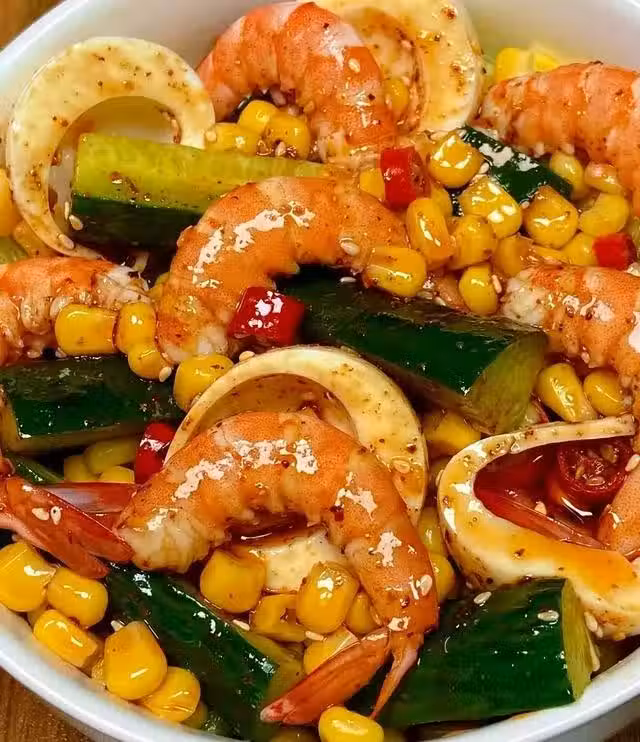 食材準備:蝦、雞蛋、玉米粒、黃瓜、大蒜、白芝麻、小米辣、辣椒麵、食用油或橄欖油、生抽、蚝油、醋、白糖。