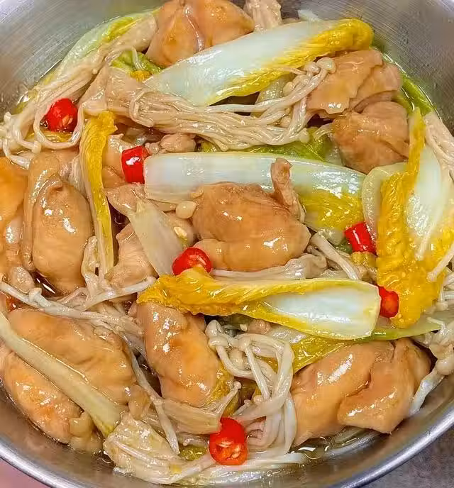 2.鍋底放少許食用油,油熱,鋪上一層金針菇,再放雞腿肉鋪平整,最後鋪一層娃娃菜,倒入腌制雞肉的料汁,再加半小碗清水蓋上蓋子中小火燉20分鐘,中間翻面,直到雞肉熟後拌勻即可。
