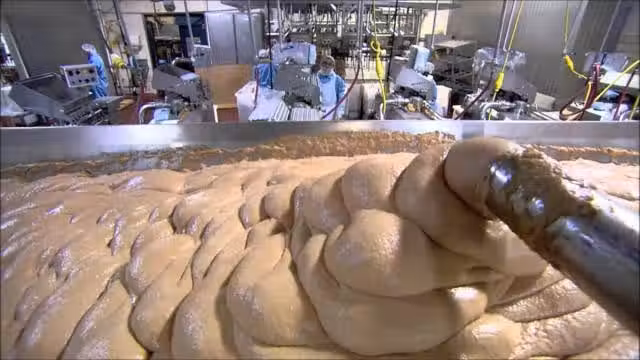 只見一筐筐肉塊,被放上流水線,排著隊進入攪碎機。機器十分強力,效率非常高,眨眼間,肉塊就變成了碎肉末。肥瘦是分開的,它們被分別加工成肉泥狀,然後又相逢在流水線上。