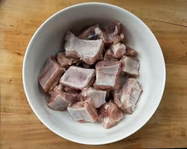 3、排骨控干水後,放到大點的碗里。如果感覺控水比較麻煩費時的時候,可以用廚房用紙將排骨的表面擦乾水,這樣可以省下不少時間。