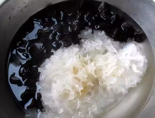 製作過程:第一步,木耳和銀耳需要事先放入30度的溫水中浸泡,半個小時的時間,將雙耳充分泡發,去掉雙耳的蒂,將其處理分別處理乾淨,銀耳撕開;