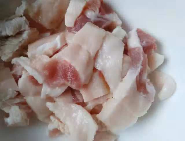 第三步,肥豬肉一小塊切成薄片,熱鍋中加上少許的食用油,涼油放入肥豬肉,小火煸出油脂,將切好的蔥姜、蒜末、辣椒丁放入鍋中,小火煸炒出其中的香味;