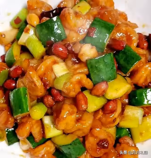這道菜酸甜可口,黃瓜脆爽,蝦仁Q彈,花生酥脆,小孩特別愛吃。