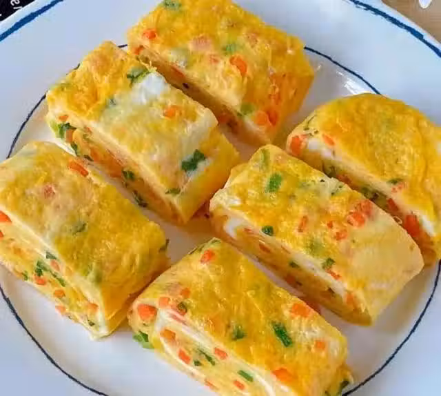 3.繼續倒入少許蛋液攤開,凝固後再從蛋卷處捲起,依次重複,直到把蛋液攤完。