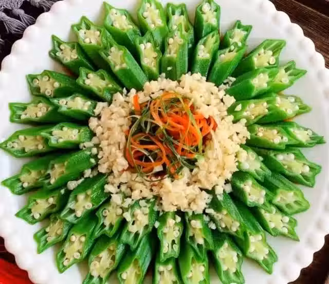 2.大蒜切末,紅椒,小蔥切成細絲放在盤中間,潑入熱油即可。這道白灼秋葵清脆爽口,咸鮮味美,把秋葵這樣擺成一盤,像一朵盛開的鮮花,取名富貴花開,寓意來年吉祥如意,大富大貴。