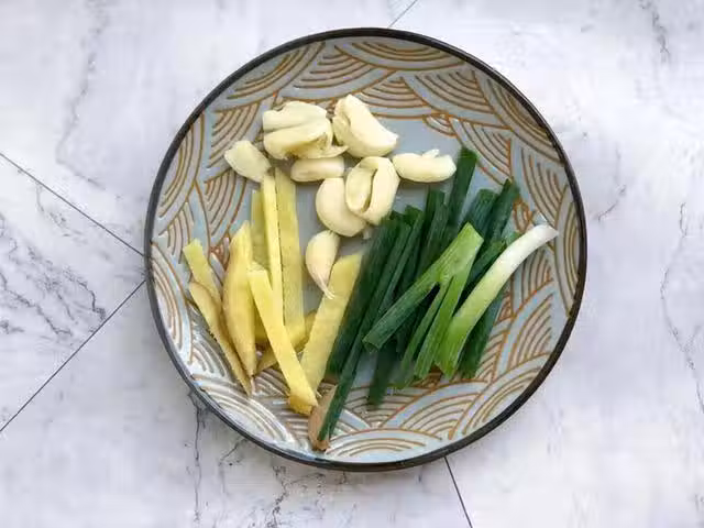 第三步:起鍋燒油,油熱後,將薑絲和蒜瓣下鍋,小火慢慢煸至略微乾癟,把薑絲和蒜瓣的香味炒出來。~~~~