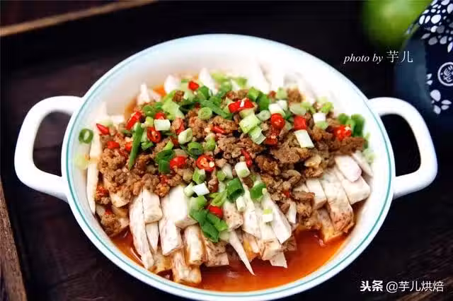 5.將腌好的芋頭條擺放在盤子裡,再將爛肉臊子舀到芋頭面上。