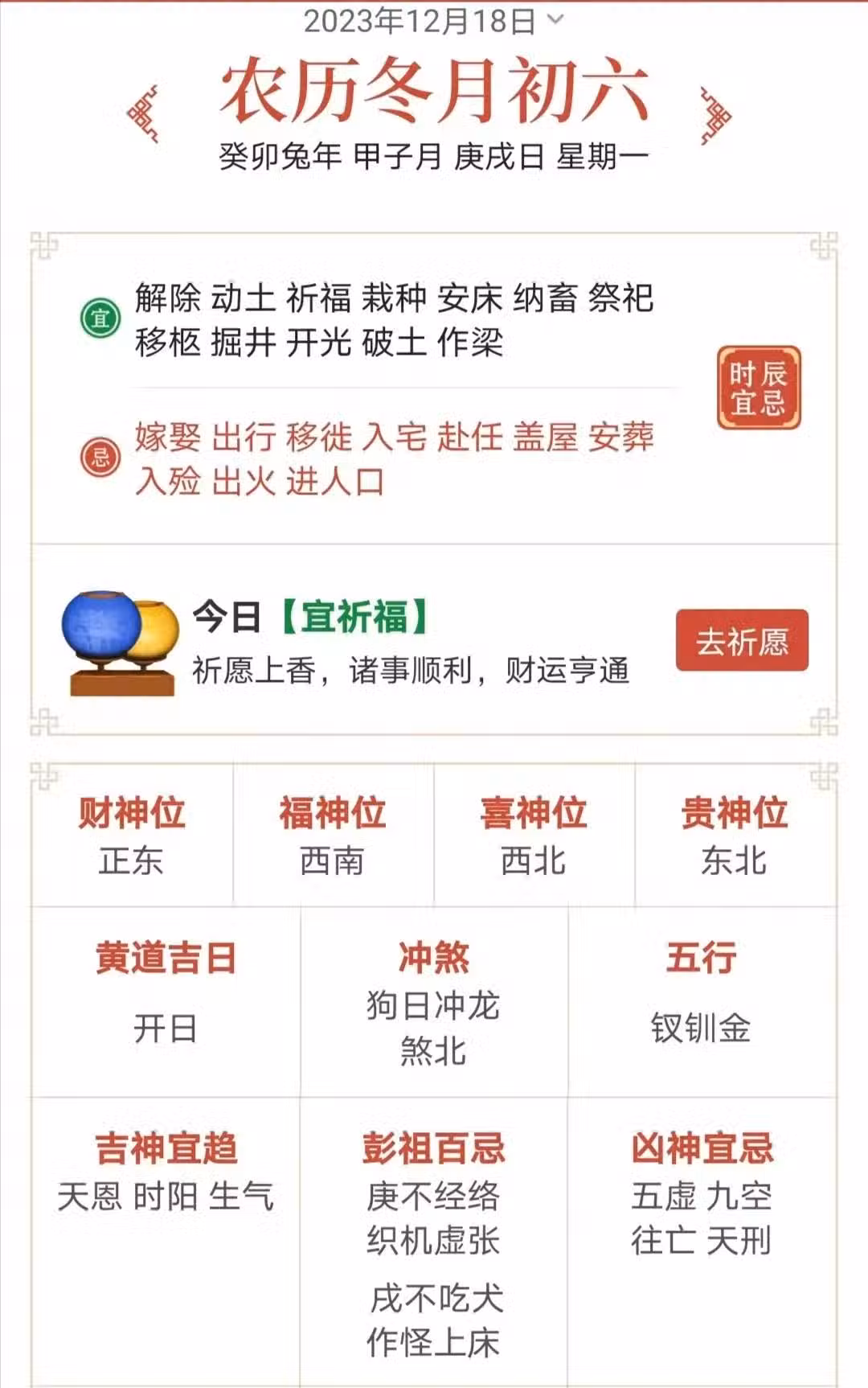【2023年12月18日,星期一,農曆二零二三年冬月初六,甲子月庚戌日】