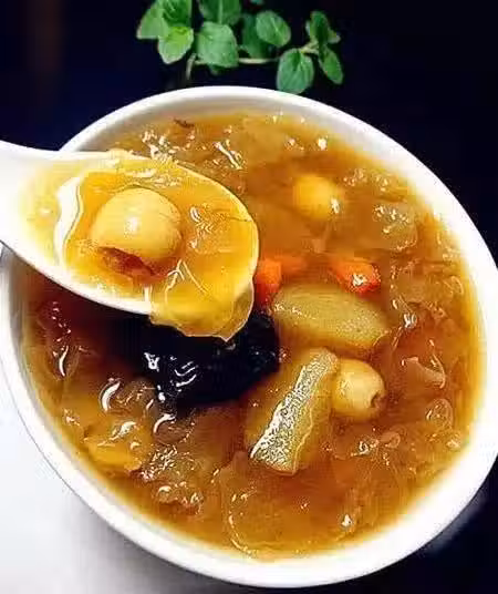 4、放入壓好的銀耳中繼續煮片刻至梨變軟即可,盛入碗中。