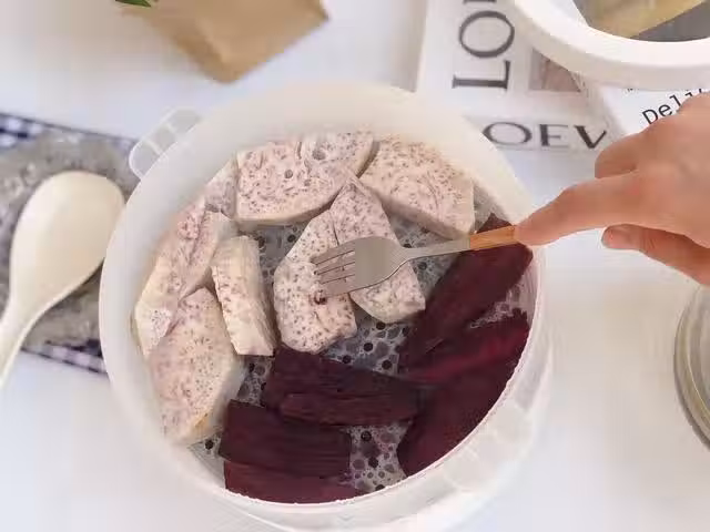晾涼後,將紫薯和芋泥分別加入純牛奶,用叉子不斷擠壓成泥,也可以放入料理機中攪拌成泥。~~~~~~~~~~
