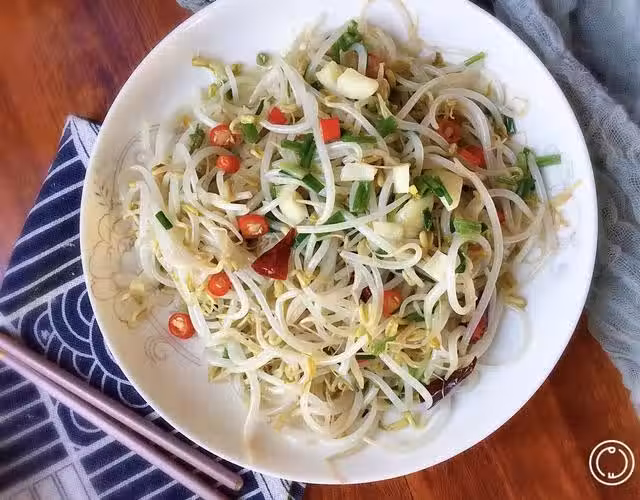 製作過程:1、我們先將豆芽清洗乾淨充分瀝干水分備用;2、鍋中水煮沸後,將豆芽先下鍋焯燙,焯燙至斷生就要撈起,立馬沖一下涼水,使豆芽保持清脆口感。3、起鍋燒油,油熱後,將蒜瓣、花椒等下鍋煸香,再把豆芽下鍋,大火快炒出鍋,出鍋前加點鹽調味,加點香蔥點綴一下,豐富整道菜的口感和味道。