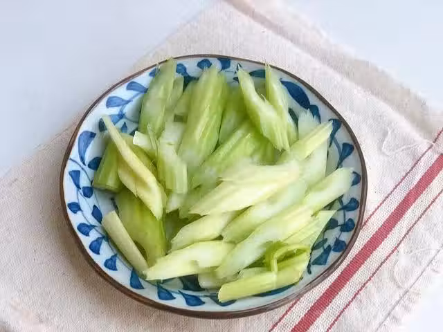 第二步:起鍋燒水,水煮沸後,加點鹽和食用油,把西芹下鍋焯燙。焯燙不僅可以去除殘留在芹菜表面的農藥殘留物,還可以去除芹菜澀味和草酸,食用起來更健康。