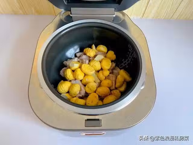 3.今天用電飯煲來燉湯,把排骨,板栗,薑片都放入電飯煲中。