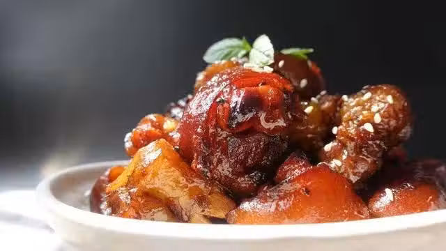【材料】豬蹄3個(約700克)、鹽1茶匙(5克)、冰糖1小塊、白酒1湯匙、紅葡萄酒10湯匙、老抽2湯匙、醋1茶匙、花椒10粒、八角2個、桂皮1塊、干紅椒1個、薑絲少許、蒜片少許、紅椒1根