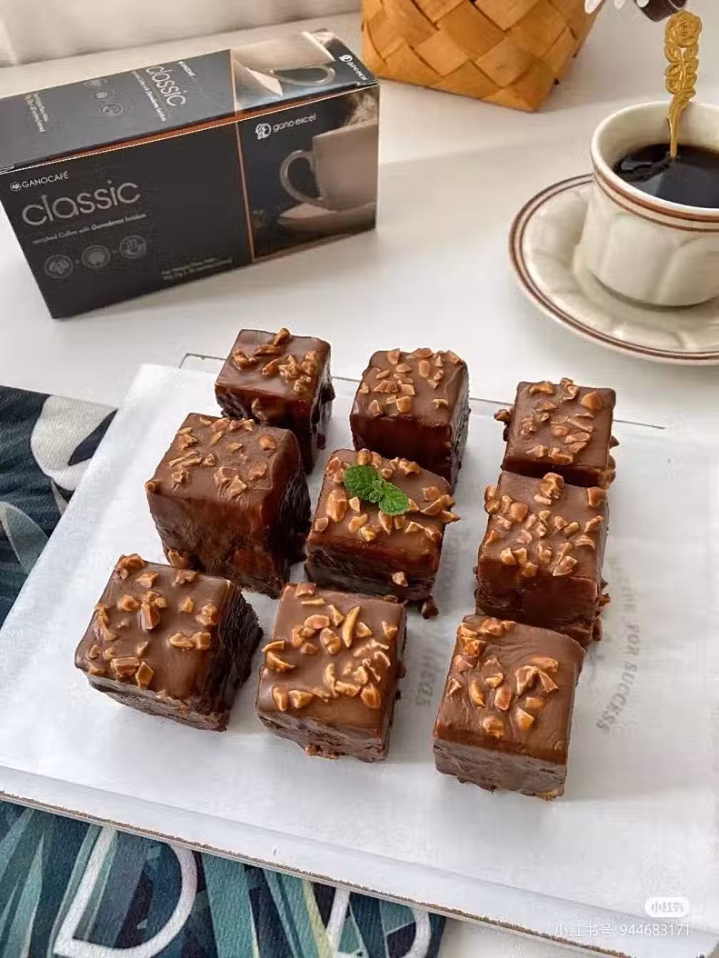 2.巧克力,椰子油隔熱水融化放入花生碎攪拌均勻,咖啡慕斯蛋糕切小塊,把巧克力醬淋在上面,冷藏幾分鐘定型即可。