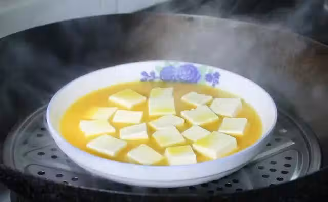 第三步,起鍋燒水,水沸騰了以後放上屜板,把裝有豆腐雞蛋液的盤子放在上面進行蒸煮,時間控制在八分鐘左右,蒸好後拿出。