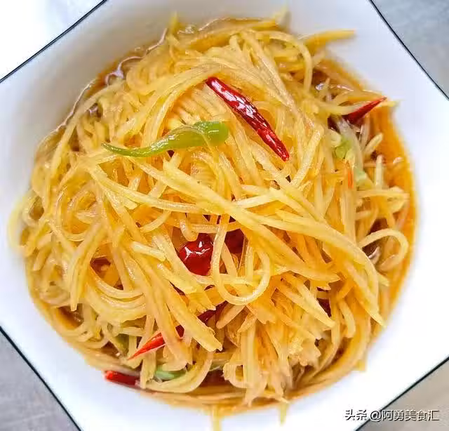 3、鍋至燒水,把土豆絲放進去焯二十秒撈出來,撈出來過涼水。再控干水分。