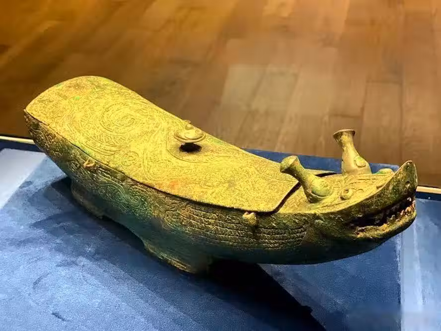 觥,是一種盛酒器,出現於商代晚期,沿用至西周早期。據研究,龍形觥可能是用來罰酒的器具。最為可貴的是,在它的裝飾花紋中驚人的出現了鱷魚的形象,這在國內的青銅器中是獨一無二的。