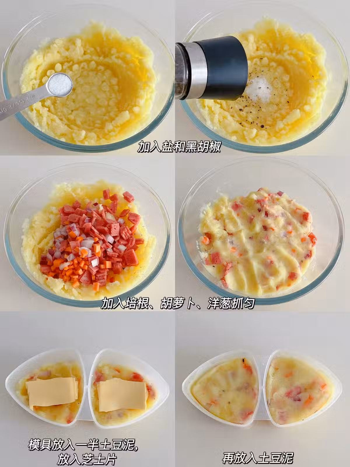 3️⃣模具里放入一半土豆泥➕芝士片➕土豆泥,壓實取出,再分別裹上澱粉➡️蛋液➡️麵包糠,放入蒸烤箱選擇三重加濕烤模式,180度烤15分鐘