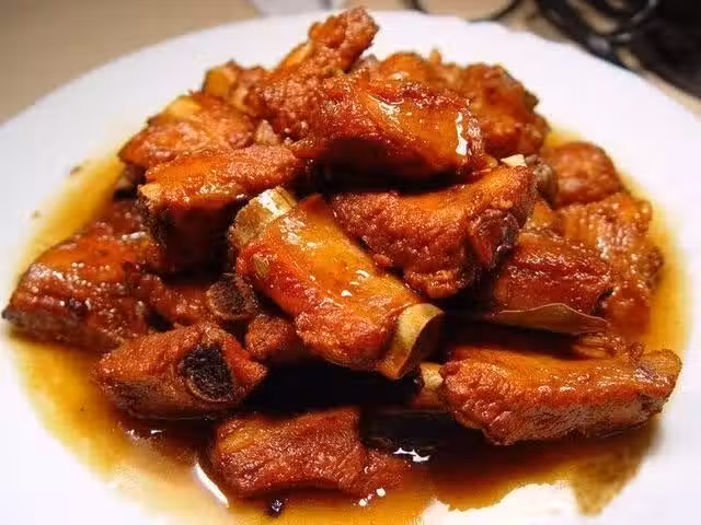 原料:排骨500克,蔥白1根,姜2片,蒜4瓣,香葉2片,桂皮1塊,大料1朵,油1勺,冰糖35克,醬油1勺,黃酒4-5勺,鹽1小勺。