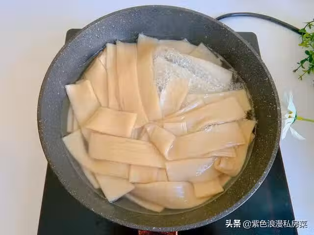 5.鍋中放清水,水開後放寬粉,寬粉煮熟後撈出,放入碗中,紅薯粉很Q彈勁道,喜歡吃軟爛一點的就要多煮一會。