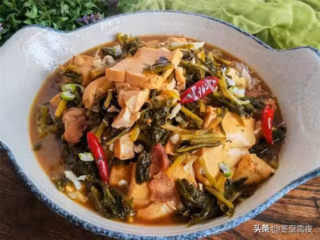 【雪裡蕻燉豆腐】所需材料:腌雪裡蕻1把、北豆腐1塊、五花肉120克、油適量、蔥1段、姜2片、大蒜3瓣、干辣椒4-5個、花椒粉1茶匙、醬油1湯匙、料酒半湯匙、味精1茶匙、