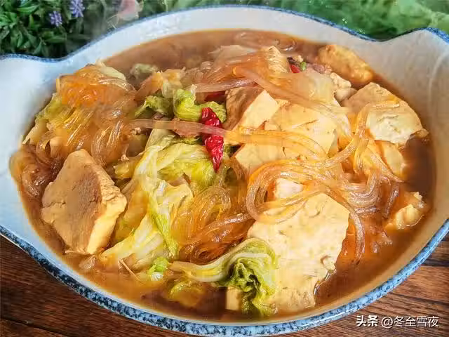 【白菜豆腐燉粉條】所需材料:大白菜半棵、粉條1把、豆腐1塊、五花肉100克、油鹽適量、蔥1段、姜2片、大料2個、生抽醬油2湯匙、料酒半湯匙、