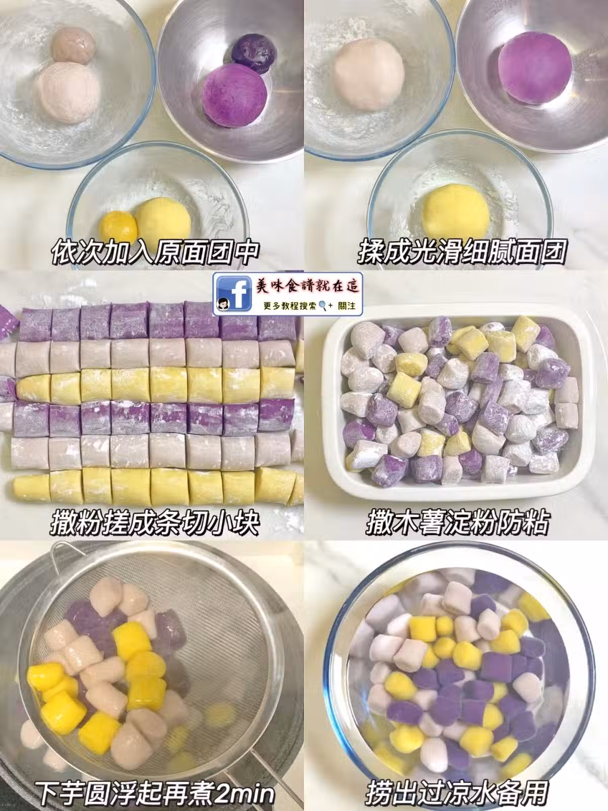 ❸依次揪1/3麵糰放入開水中煮2min加入原麵糰揉成團搓成長條切小塊 撒木薯澱粉防粘