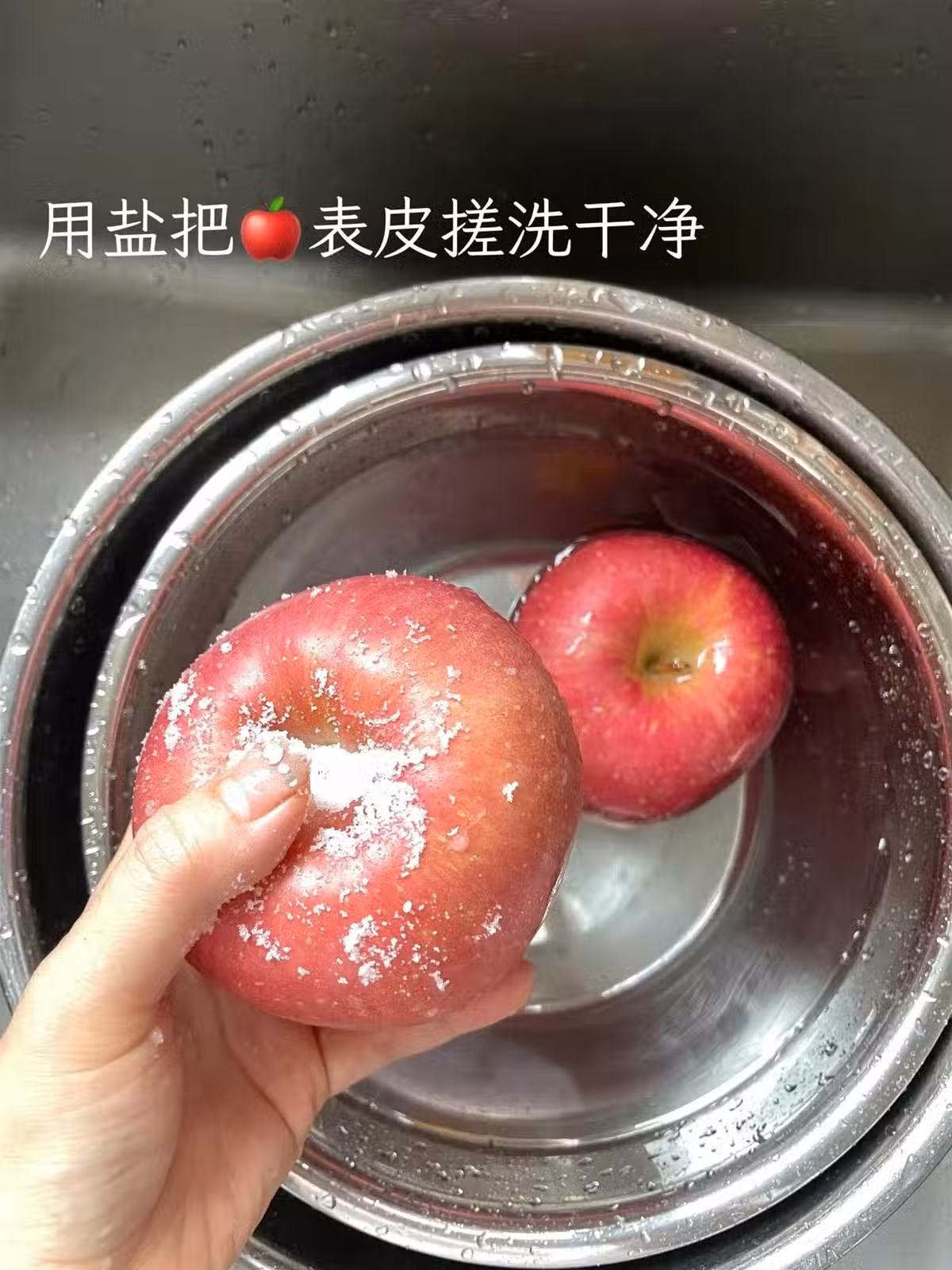1、蘋果表皮用鹽搓洗干凈(不需去皮,果皮上的果膠對大便有好處)