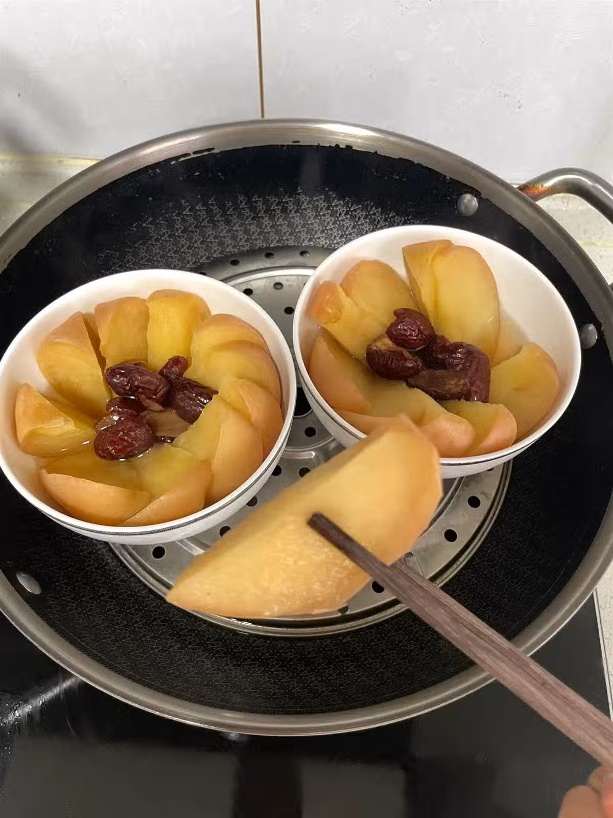 蒸過後的蘋果酸酸甜甜,口感很好,我閨女喝湯,我吃果肉