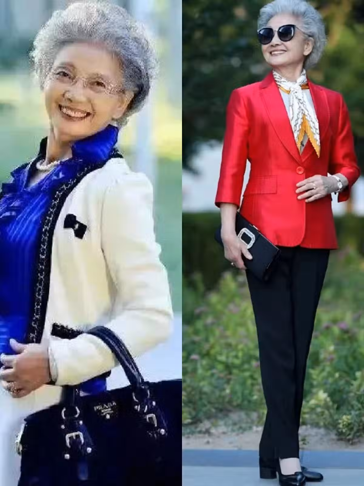 過了90歲的女人,在色彩運用上不能太沉悶,看起來蔫巴巴。我們要運用彩色系服飾提亮氣色,比如紅色、藍色、綠色或者黃色。