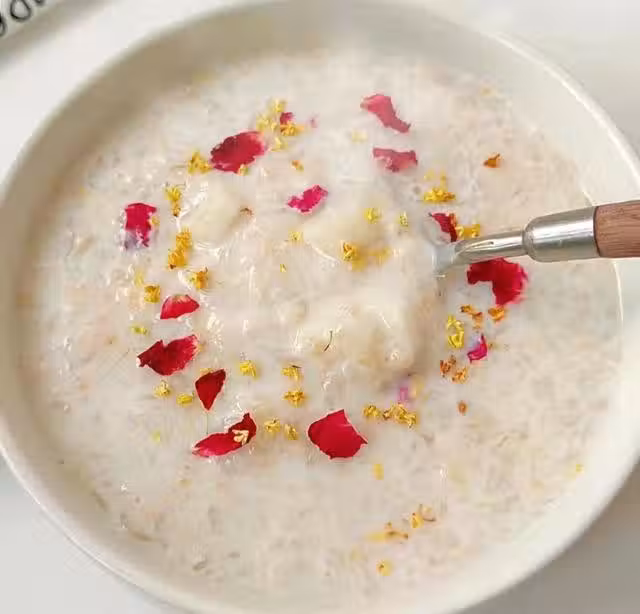 食材準備:銀耳1小朵,燕麥80g,鐵棍山藥50g,牛奶200ml等。