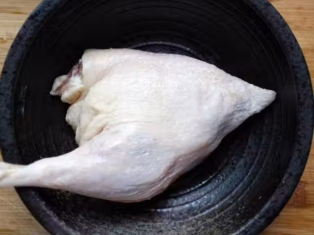 3、把鴨腿放入一個大的容器里,將薑片、蒜粒、生抽、蚝油、老抽、黑胡椒、料酒、冰糖、少許鹽、花椒、五香粉倒入大碗內,然後再加入與食材平齊的水。送入冰箱腌制3小時左右。時間允許的話,建議腌制的久些,比較入味