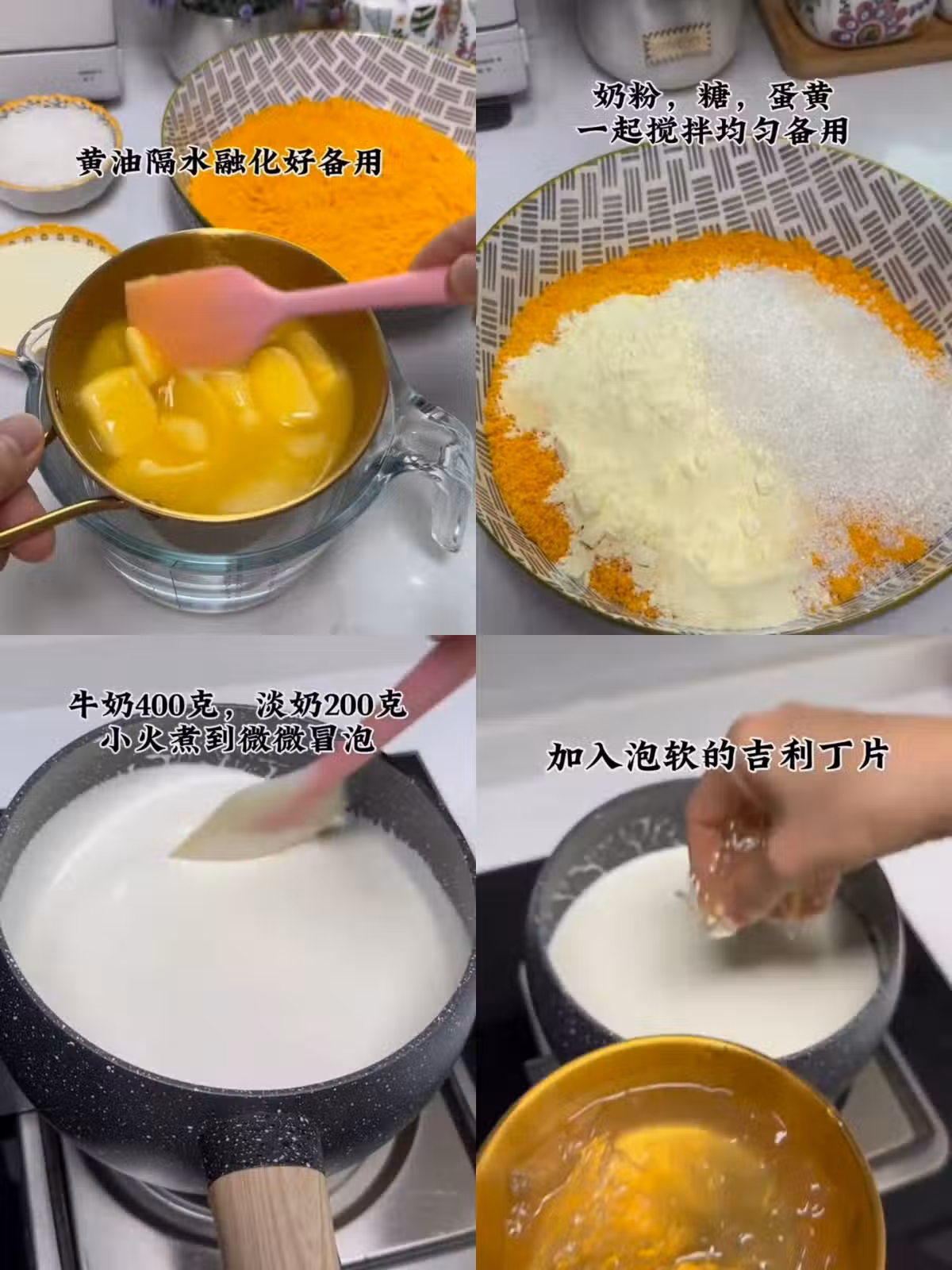 3️⃣牛奶和淡奶小火煮到微微冒泡後,加入泡軟的吉利丁片攪拌均勻,趁熱倒入蛋黃裏面攪拌均勻