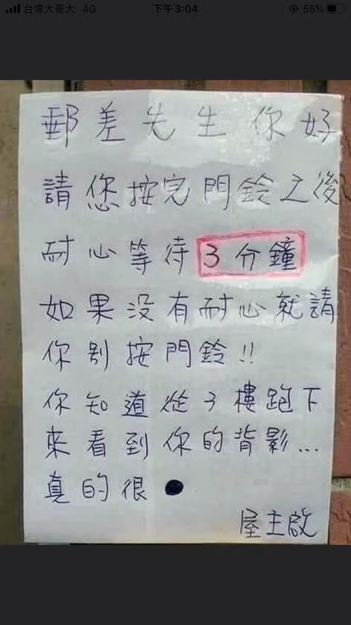 這位媽媽在臉書社團「爆怨公社」表示,她自從搬來這第二年開始,郵差送掛號就只會在門口大喊門牌號碼,她聽到郵差檔車的聲音就會立刻跑下去,「等著郵差從路口騎到路尾,我從來沒有看過郵差按過我們這一排住戶的門鈴,甚至是我人明明就在外面,郵差也是邊喊號碼邊往下一戶騎」,都要她跟在機車後面追趕才收得到掛號。