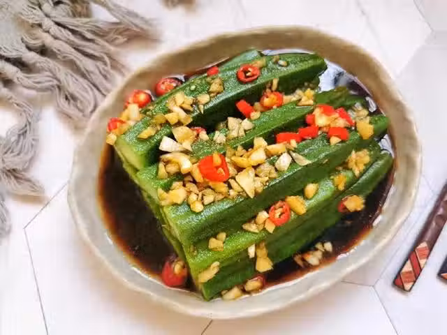 5、將調好的料汁淋在秋葵上面,就可以吃了,也可以燒兩勺熱油淋在上面。