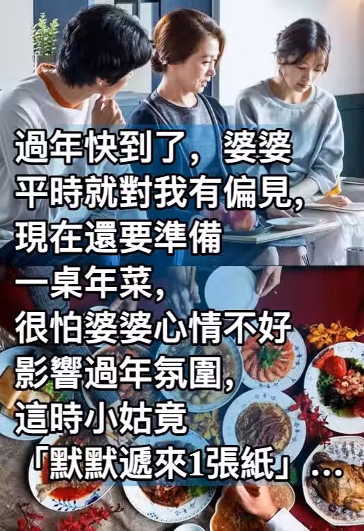 過年快到了,婆婆平時就對我有偏見,現在還要準備一桌年菜,很怕婆婆心情不好,影響過年氛圍,這時小姑竟「默默遞來1張紙」…