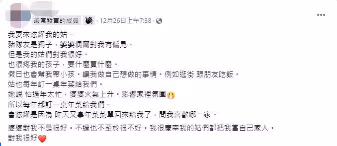 也有網友分享遇到「天使姑」的經驗:「我的姑也很好,雖然看起來冷漠,但其實是豆腐心,默默對人好的那種人,其實不用做多,不挑撥離間的都是好菇了」、「我家也是這樣,只有婆婆愛找碴,慶幸有暖心的姑跟大伯」、「我的大姑、小姑、婆婆、小叔也都很好,我相信還是有好相處的家人」、「我也有很讚的小菇跟小叔,過年前小菇會請人打掃婆家,不用我們操心,買好吃的也一定有我們的分」。