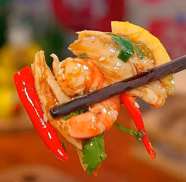 步驟三:再加點煮熟的蝦仁、去籽檸檬片的、小米辣、香菜碎,倒入剛剛調好的料汁,拌勻就可以開吃了。