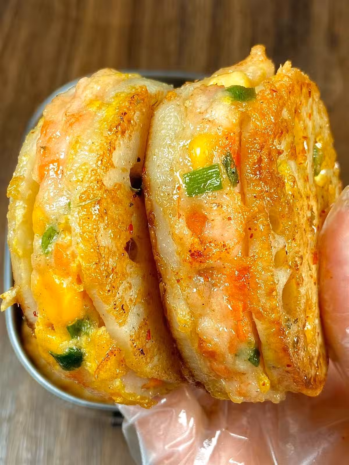 外面焦香焦香的,裡面的蝦滑咬開還會爆汁勒!!外面裹的蛋液煎出來金黃金黃的真的很絕!!出鍋可以撒些辣椒粉,椒鹽粉吃哦!!