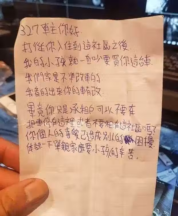 不要影響我兒子!他車子改太帥「被陌生家長貼紙條」 怒嗆「你只是承租戶」:車可以不要停社區嗎!
