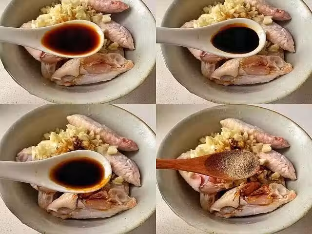 (2)到第二天,雞翅腌制好了。用吸濕紙將雞翅表層的水分吸至半乾的狀態,並在玉米澱粉中裹一遍,讓整個雞翅都完全裹上澱粉,裹完後將雞翅輕微壓一下,按這樣的方法將所有的雞翅處理完。