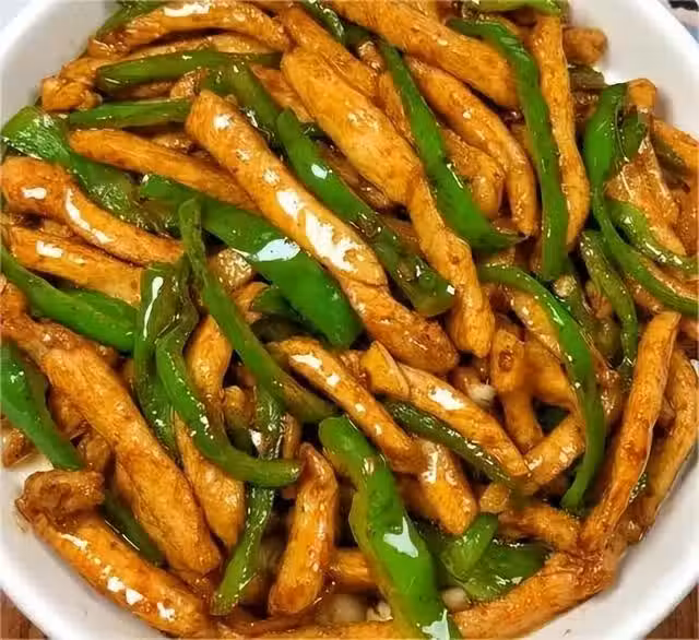 將雞胸肉切絲,青椒去籽切絲。鍋中加油燒熱,放入雞胸肉絲炒至變色,再加入青椒絲翻炒。最後加入鹽、生抽調味,炒至青椒熟軟即可。